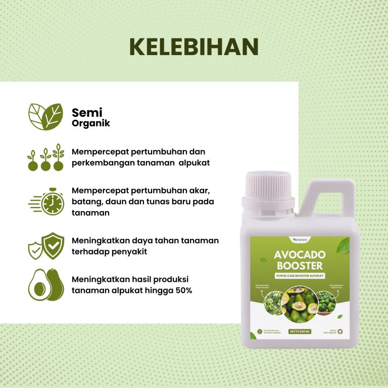 Pupuk AVOCADO BOOSTER ini membuat rasa buah lebih manis, daging buah lebih tebal, lebih besar dan seragam. Serta membuat tanaman lebih tahan terhadap layu fusarium & layu bakteri karena adanya Zat Pengatur Tumbuh (ZPT) sekaligus dapat meningkatkan antibody tanaman.