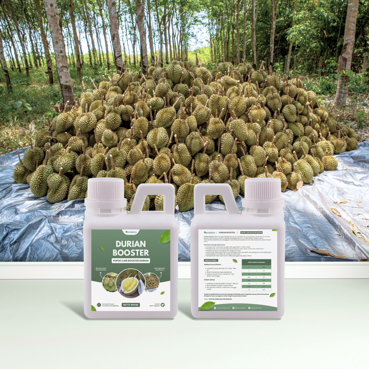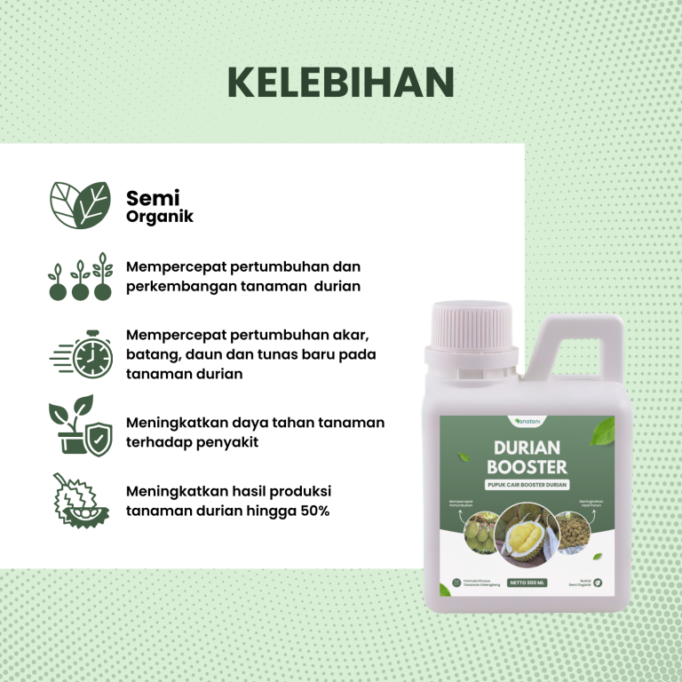 Pupuk DURIAN BOOSTER ini membuat rasa buah lebih manis, daging buah lebih tebal, lebih besar dan seragam. Serta membuat tanaman lebih tahan terhadap layu fusarium & layu bakteri karena adanya Zat Pengatur Tumbuh (ZPT) sekaligus dapat meningkatkan antibody tanaman.
