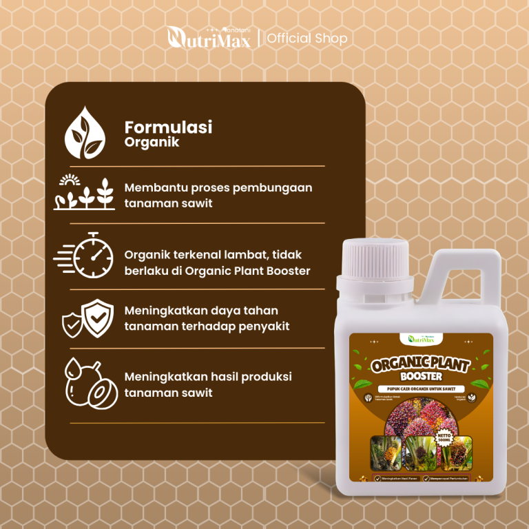 Organic Plant Booster Sawit spesialis tanaman yang dapat membuat hasil buah sawit lebih banyak dan besar, formula dari bahan organik yang aman dan ramah lingkungan, membuat tanaman lebih tahan terhadap serangan penyakit, serta dapat meningkatkan hasil panen.