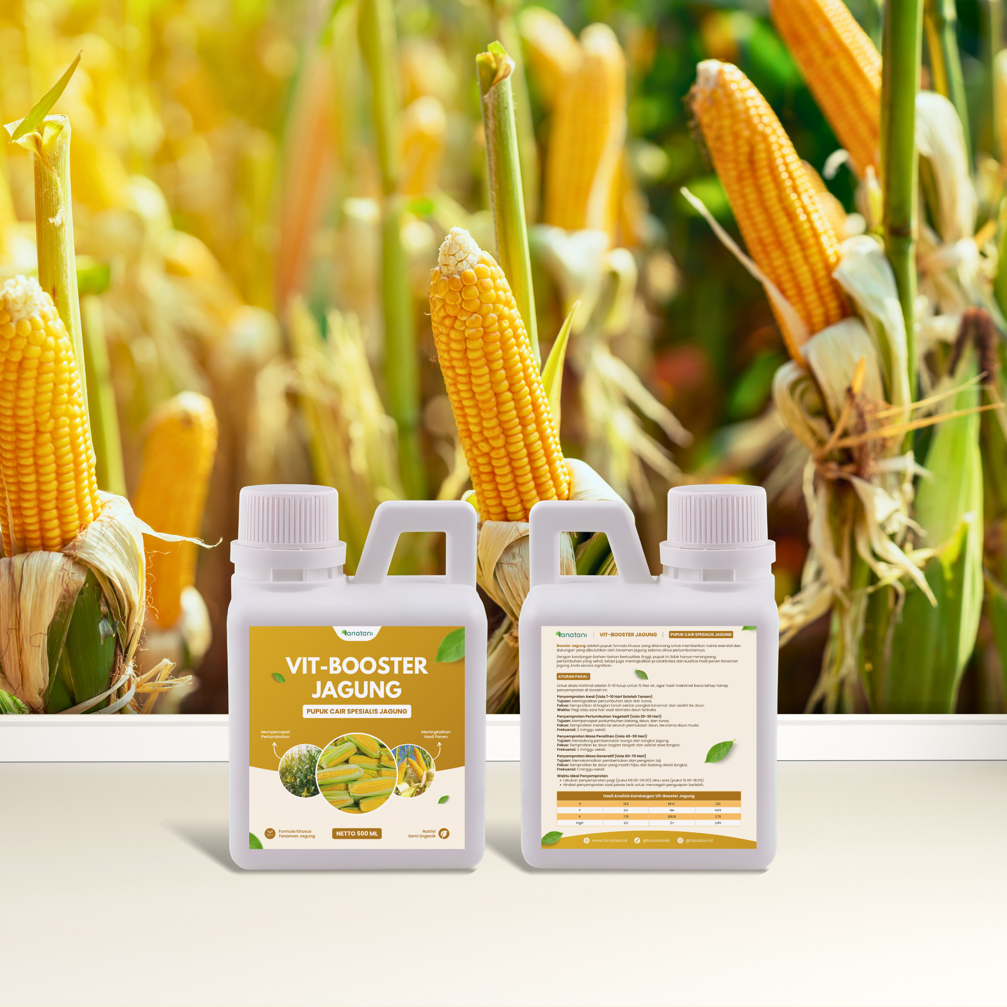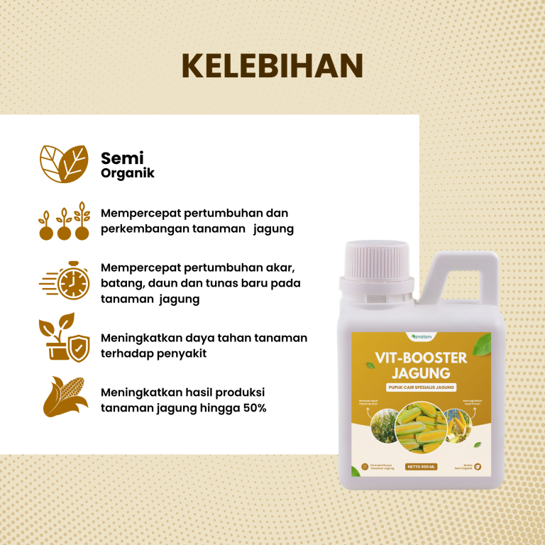 Vit-Booster Jagung juga dilengkapi Phosphate (P), Kalium(K), dan juga Asam Amino, Vi+- Gula, Asam organik dari ekstrak fermentasi alami di aplikasikan pada fase Generatif.